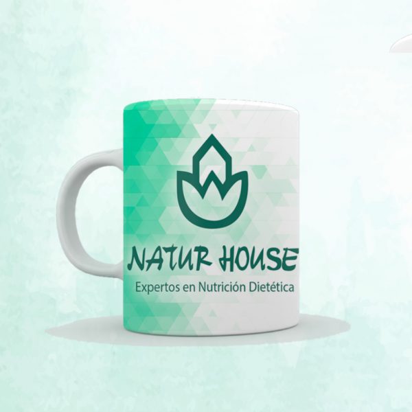 Tazas especiales sublimadas con diseño de Naturhouse y el nombre desees impreso en otro lado.